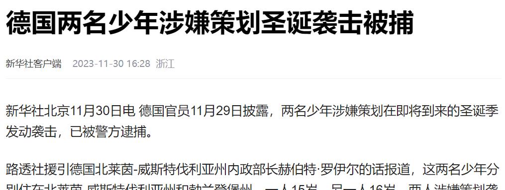 稍早一些,“新华社”援引多家外媒报道称,两名分别为15岁和16岁的青少年策划袭击圣诞集市,已被警方逮捕,消息人士透露,16岁的那名罪犯是外国移民,他们策划袭击科隆的圣诞集市。2016年,柏林就曾经发生过圣诞集市恐怖袭击事件,恐怖分子驾驶货车冲进人行道,造成12人死亡、数十人受伤。