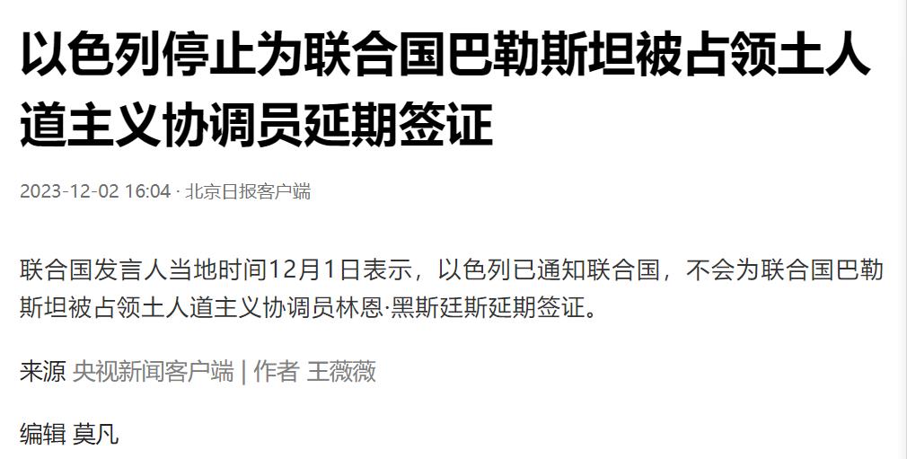 以色列对联合国的不满持续升级,继公开呼吁联合国秘书长古特雷斯辞职后,以色列外交部负责联合国和国际组织事务的办公室副主任阿米尔·韦斯布罗德公开宣布,在联合国巴勒斯坦被占领土人道主义协调员林恩·黑斯廷斯的签证于本月20日到期后,以色列不会再为其续签,“我们遗憾地通知您,黑斯廷斯女士已经失去了以色列当局的信任和信心,不再能够有效履行与以色列相关官员的职责。”