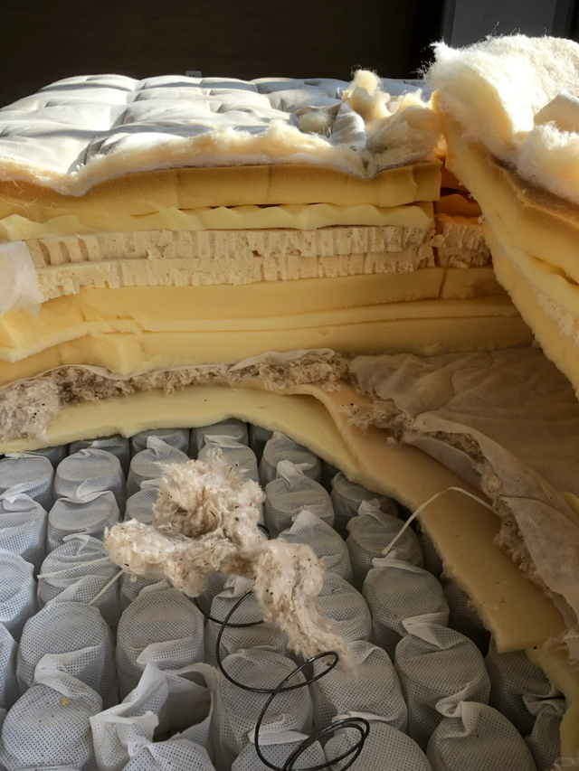 优质的填充物能够提供稳定的支撑和舒适的睡眠体验,而劣质填充物则可能导致床垫变形、塌陷等问题,很多国产合成乳胺/TDI海绵床垫的价格可能很吸引人,但几年后填充物氧化掉渣的问题,甚至影响睡眠质量。