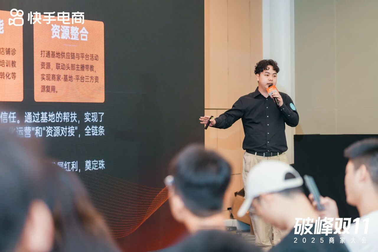 平台政策的落地深化,离不开优质服务商的协同发力。作为服务商代表,域骉控股受邀上台分享实践经验,基地业务负责人温嘉庆围绕公司服务定位与实践成果展开详细讲解。深耕珠宝行业多年的域骉控股,已构建起覆盖多维度的全链条服务矩阵,以“珠宝产业带成长伙伴”身份深度贴合快手“真实、普惠”的生态基因与“老铁经济”的信任内核,为商家提供从起步到爆发的全周期支撑。
