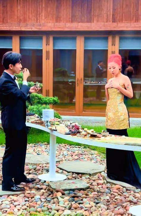 刘一丝的出场让人眼前一亮。她不仅把头发染成了时髦的红色,手臂上的纹身也相当有个性,配上精致的妆容,整个人散发着自信的光芒。先是穿着中式红色礼服举行仪式,后又换上经典白色婚纱,实现了中西结合的婚礼梦想。