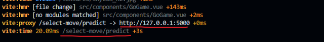 export default defineConfig({ plugins: [vue()], server: { proxy: { '/select-move': { // 匹配/select-move开头的请求 target: 'http://127.0.0.1:5000', // 转发的目标服务器 changeOrigin: true, // 允许跨域 } }, },})代理配置完成后,还有可能出现最终请求并不成功,查来查去也找不到原因,看起来就是代理没有生效。这里告诉大家一个排查的方法,就是在开启npx vite --debug的debug选项,这样代理请求的真实服务器地址、path路径都会打印出来,具体是什么原因导致的很轻松地就能找到,如果确信代理的配置没有问题的话,还可能是后端接口请求参数、路径等不正确导致接口返回报错了。