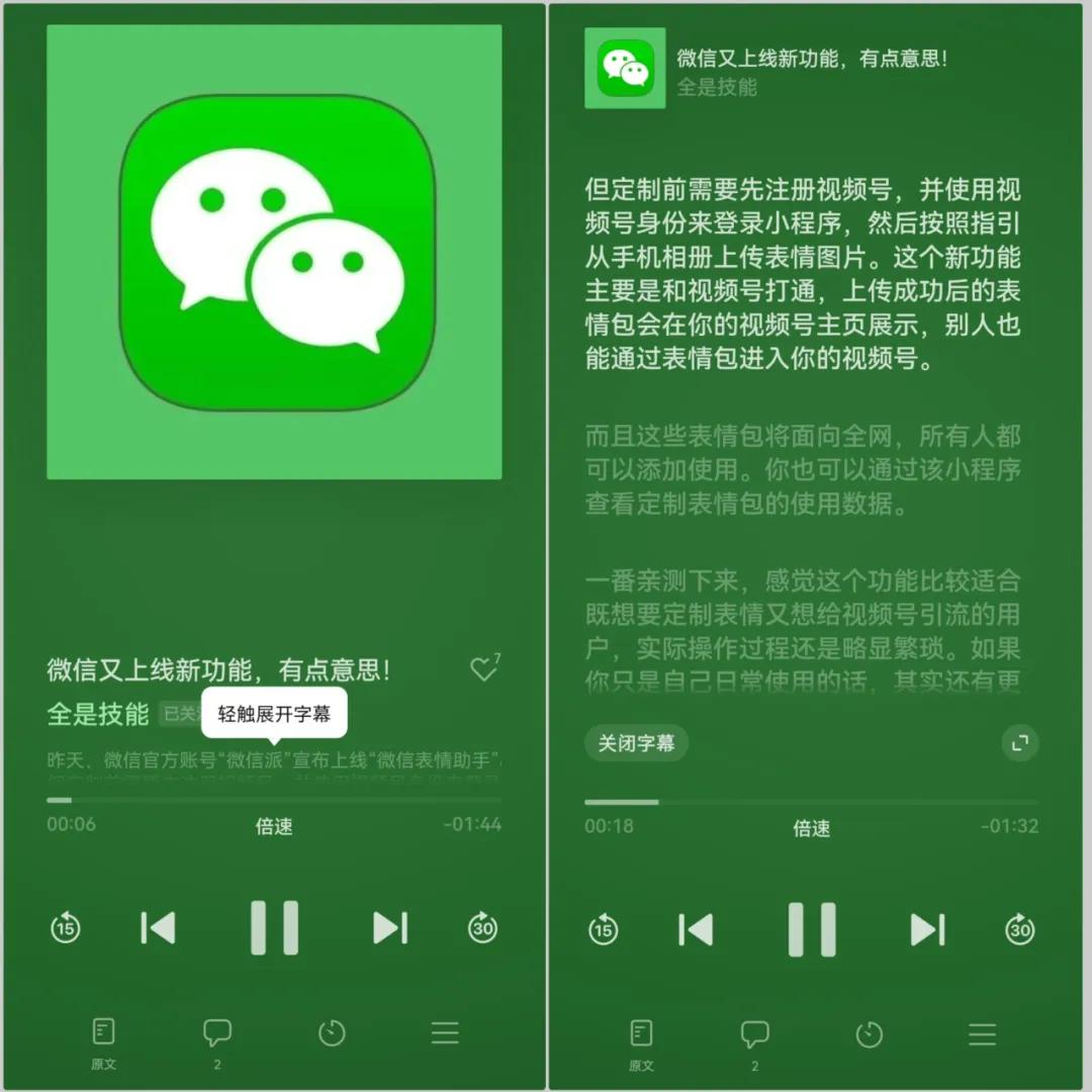 现在使用听一听、公众号听全文、音乐播放时,都改为缩小版浮窗,展开也只显示音频标题。