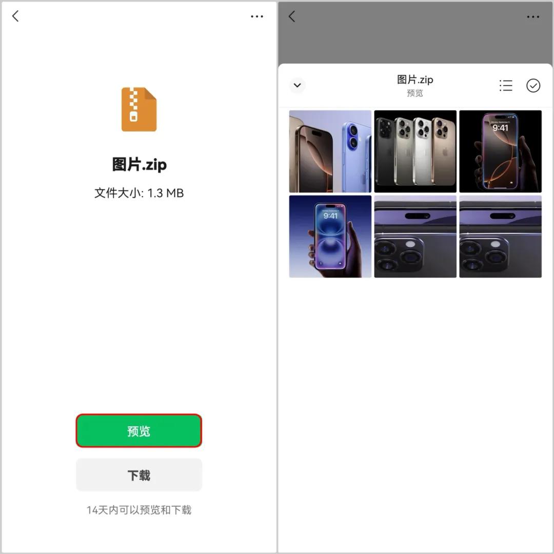预览完再决定是否下载,也不用跳转第三方App,既省流量又省空间。该功能适用于zip、word、pdf等多种格式文件。