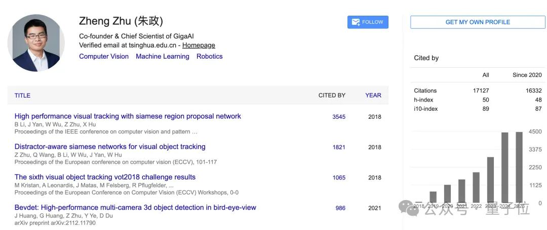 Google Scholar显示,朱政的论文被引数达到1.7w+,h-index为50。