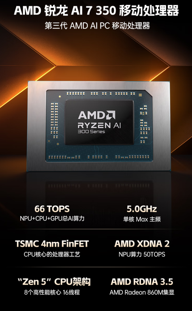 高效处理能力:搭载的AMD锐龙AI 7 350处理器,保障了多任务处理的流畅性,同时运行多个浏览器标签、Office办公软件、通讯工具等毫无压力。