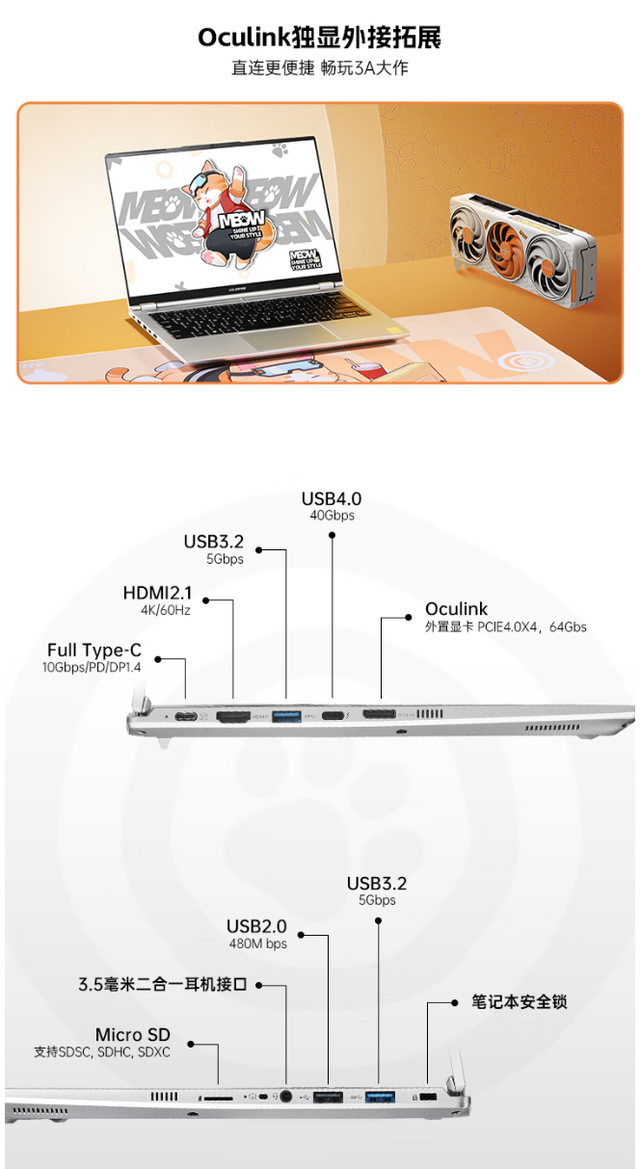强大拓展能力:不仅拥有USB 4.0接口,还有Oculink接口,可以通过多种方式连接显卡坞,进而为其提供强大的性能上限。