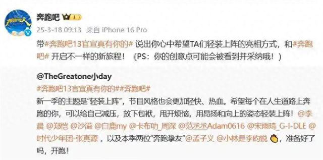 2024年3月18日,《奔跑吧》第13季官宣阵容,李晨、郑恺、沙溢、白鹿等老面孔携手两位“奔跑挚友”孟子义和李昀锐,再次引发热议。