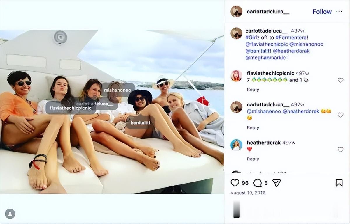 他们还翻出来了一张合照,发现梅根在游艇上和爱泼斯坦的小女友一起玩……