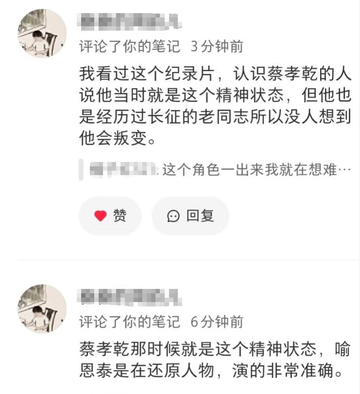 有网友说,之前看过相关纪录片,蔡孝乾当时的精神状态就是如此,因为有过长征经历,所以被安排到那个位置,喻恩泰只是在呈现原型当时的状态。