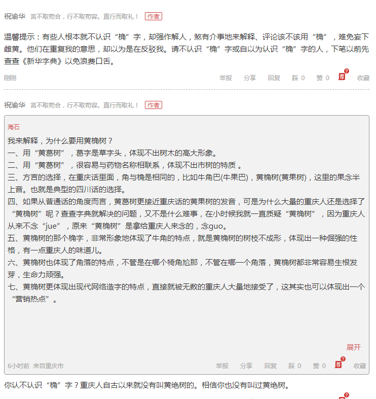“黄葛” “黄桷”孰对孰错曾引起很多争议,争议本质是书面误写与口语传统的割裂。“黄桷”者认为,历史文献虽记载“黄葛”,但民间长期使用“黄桷”,已成约定俗成的文化符号。“黄葛”者则认为错字地名有损文化严肃性。 且违背语言逻辑:真正的“约定俗成”需满足“名实统一”,但“黄桷”既无对应口语(民众仍称“黄葛”),亦未被权威词典或植物学承认。其“约定俗成”之说缺乏语言实践和学术支撑。“黄桷”是书写惰性导致的误用,纠正误写是对历史与科学的尊重。所谓“约定俗成”实为对误写的强行合理化。