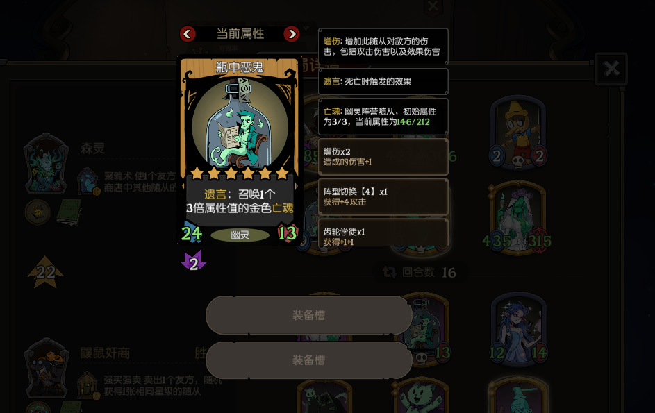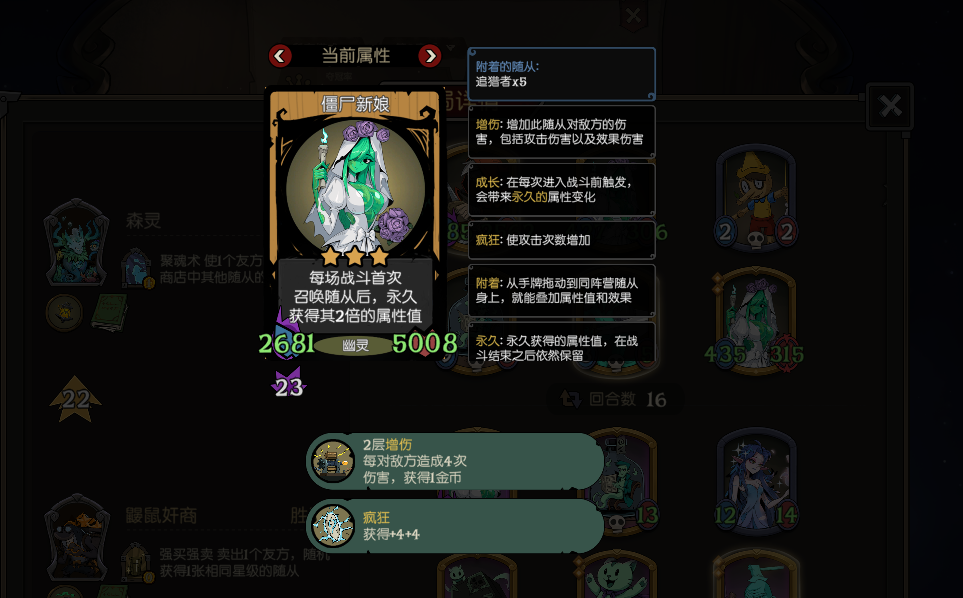这套阵容的核心就是“僵尸新娘”他的效果是每场战斗首次召唤随从后,永久获得其两倍属性,再加上新牌“瓶中恶鬼”遗言:召唤一个3倍属性的金色亡魂,在这两张卡的配合下,可以让你的阵容轻松达到破万的属性,并且每个回合都能增长。