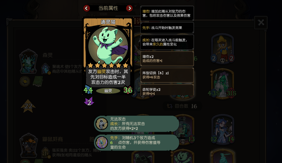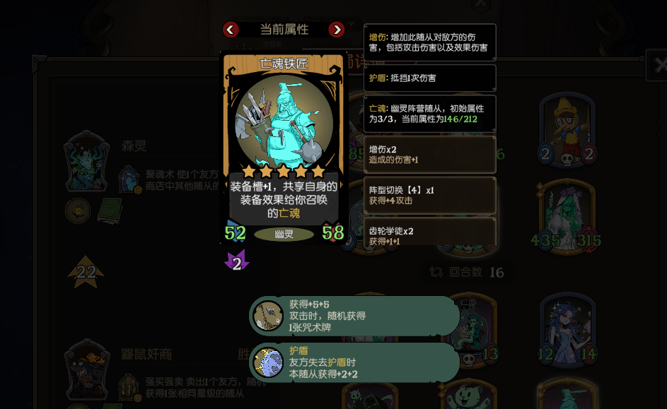 还有一张“通灵猫”也非常强,可以让友方幽魂攻击时先对目标造成一半攻击力的伤害,让幽魂自带破盾和伤害特效,再也不用害怕多盾的阵容了。除此之外,亡魂铁匠这个可以和幽魂分享装备的牌也要带一张,带上护盾就可以都挡一次,带上攻击获得咒术或者附着牌的装备也可以稳定得到资源,实现小倒转。