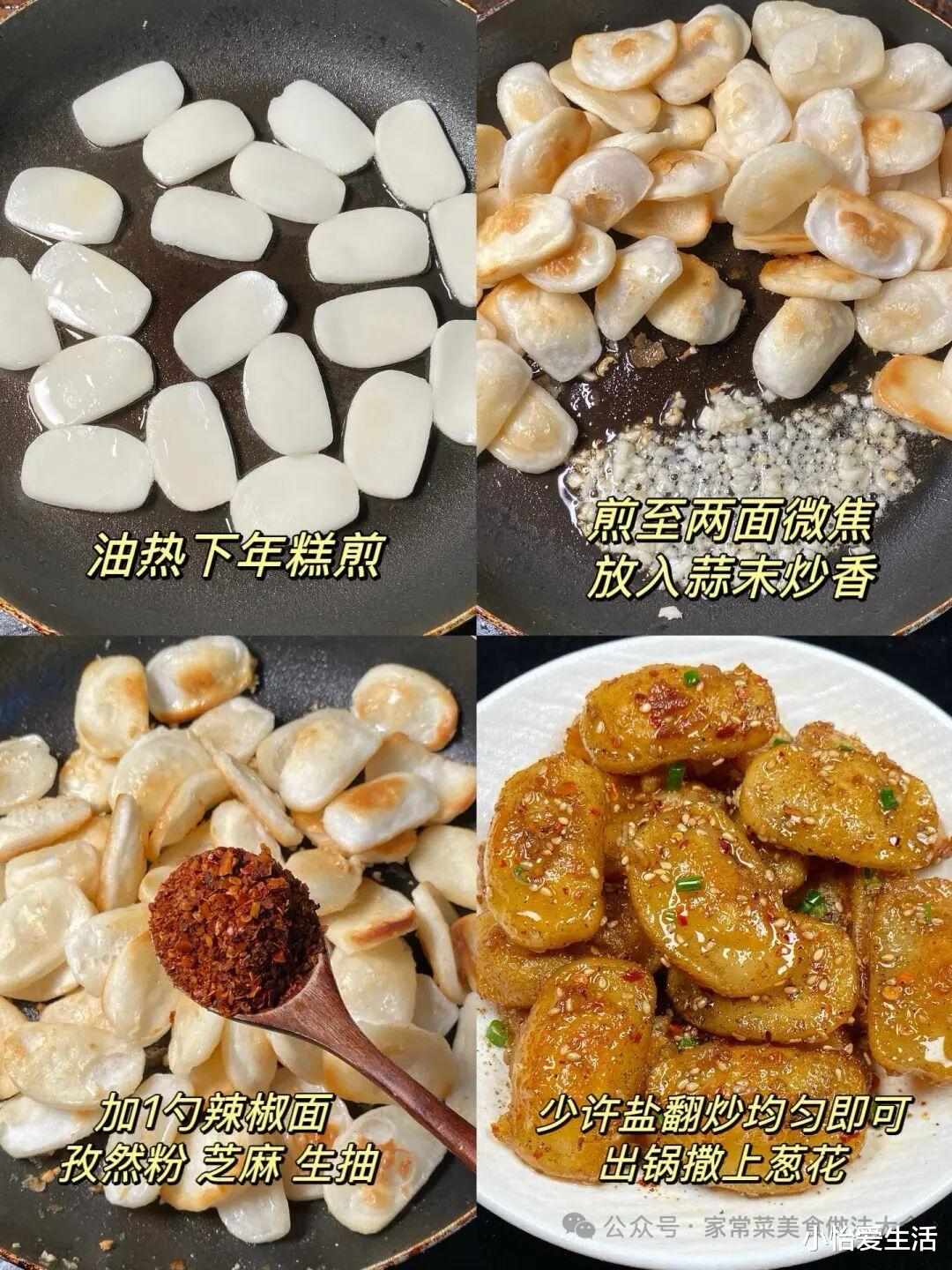 上学时学校后门有条“年糕巷”,铁板上刺啦作响,年糕被压得鼓鼓的,老板撒一把孜然、淋一圈辣油,香气顺着寒风钻进鼻腔,我们叫它“招财进宝”——吃完期末卷子上 100 分好像更容易。今天把摊儿搬回家,一口平底锅就行,关键只有两步:先煮后煎,孜然必须 double!