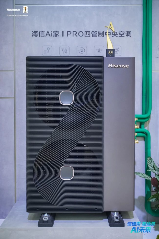 被世界经济论坛授予“灯塔工厂”认证的海信中央空调黄岛工厂是全球空调行业首座、也是唯一一座同时拥有“灯塔工厂”与“可持续灯塔工厂”双认证的制造标杆。从这座“双灯塔”工厂走出的产品,一直在不断刷新行业标准。海信Ai家II PRO中央空调,作为行业首款6合1四管制中央空调,一机即可实现空调、地暖、热水、温湿双控、新风、全屋智控六重功能,为消费者带来了“一台设备畅享全屋舒适”的极致体验,并成功斩获艾普兰金奖,进一步彰显了中国智造的领先水平。