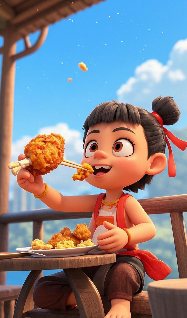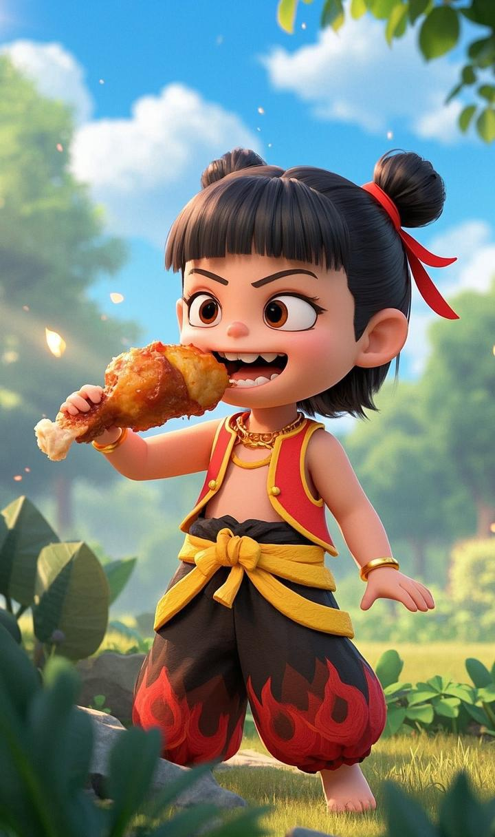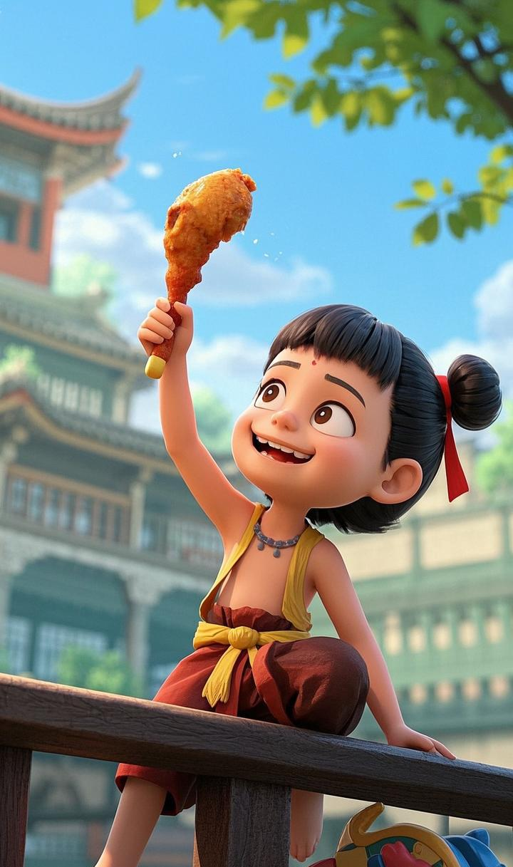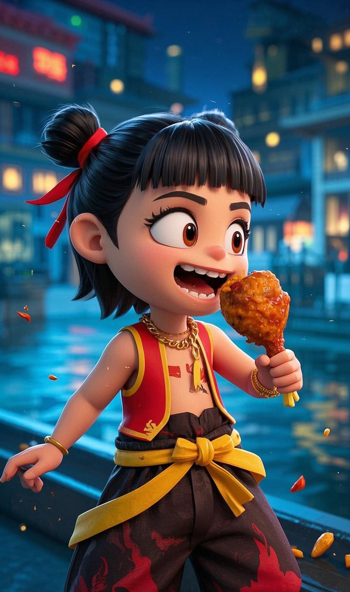 图中的哪吒以超萌的 Q 版 3D 形象示人,灵动的大眼睛,标志性的丸子头配红飘带,身着具有火焰元素的服饰,个性十足。无论是在古色古香的亭台楼阁,还是霓虹闪烁的现代街头,他享受美食时那活泼欢快的模样,既保留了神话中哪吒的不羁与可爱,又融入了符合当下审美的萌趣风格,让人忍不住心生喜爱。
