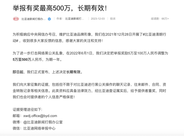 “黑公关”乱象有违国家法律法规,还严重影响汽车行业的健康发展。为反击这一行为,比亚迪在2021年就宣布悬赏5万至100万元打击“黑公关”,此后,又将举报奖励提升至5万至500万元,并长期有效。其间,一批造谣诽谤者被法院判决承担法律责任。