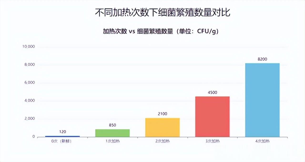 不仅如此,重复加热同一份剩菜更是危险,《食品安全五要点》指出,每一次热而冷的循环都是细菌重新繁殖的机会。微生物学研究表明,冷藏只是延缓细菌生长,并不能杀死它们,反复穿越4 ℃–60 ℃的“危险温度区”,可能让一些耐热菌存活甚至增强耐热性,相当于给它们“进化”的机会。