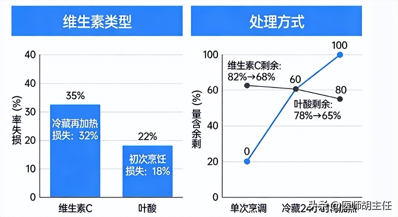 结果显示,在一般冷藏(约3 ℃)储存24小时后再加热的食物中,维生素C和叶酸的损失往往超过30%,这一损失幅度远高于仅在初次烹饪后的下降。研究明确指出,各种再加热方式下,水溶性维生素(尤其是维生素C)在经过冷藏和随后加热后,其剩余含量显著低于单次烹调状态。
