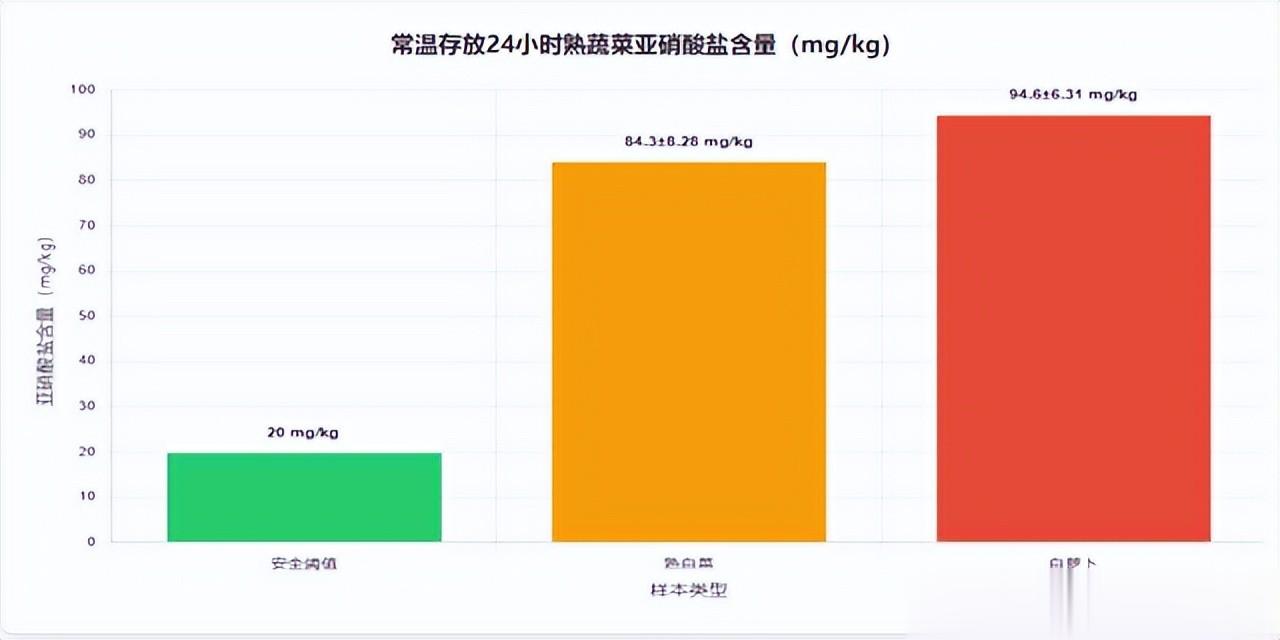 发表在《食品化学进展》期刊上的研究表明,在常温(约21℃)下存放24小时的熟白菜,亚硝酸盐含量可达到84.3 ± 8.28 mg/kg,白萝卜甚至接近94.6 ± 6.31 mg/kg,远高于被很多国家食品标准认为的安全阈值(例如常见标准中某些蔬菜加工品亚硝酸盐限量约20 mg/kg)。