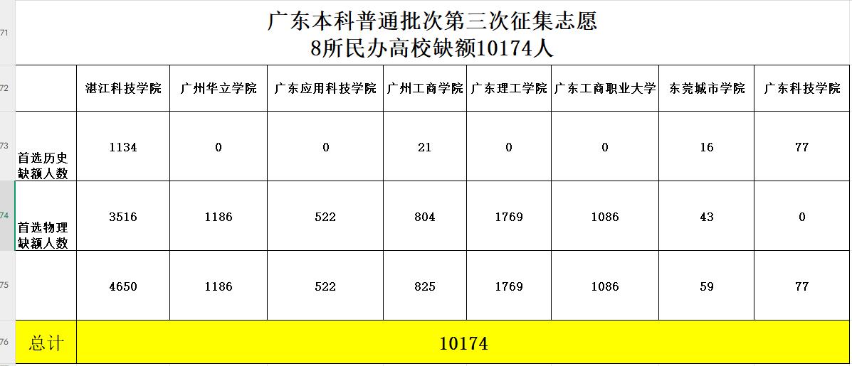 从广东省教育考试院获悉,广东本科批次仍有8所民办高校未招满,现开启第三次征集志愿,8所民办高校总共缺额10174人,其中,湛江科技学院缺额4650人,广东理工学院缺额1769人,广州华立学院缺额1186人,广东工商职业大学缺额1086人,广州工商学院缺额825人,广东应用科技学院缺额522人,东莞城市学院59人,广东科技学院77人,湛江科技学院缺额人数最多,成为招生困难户。