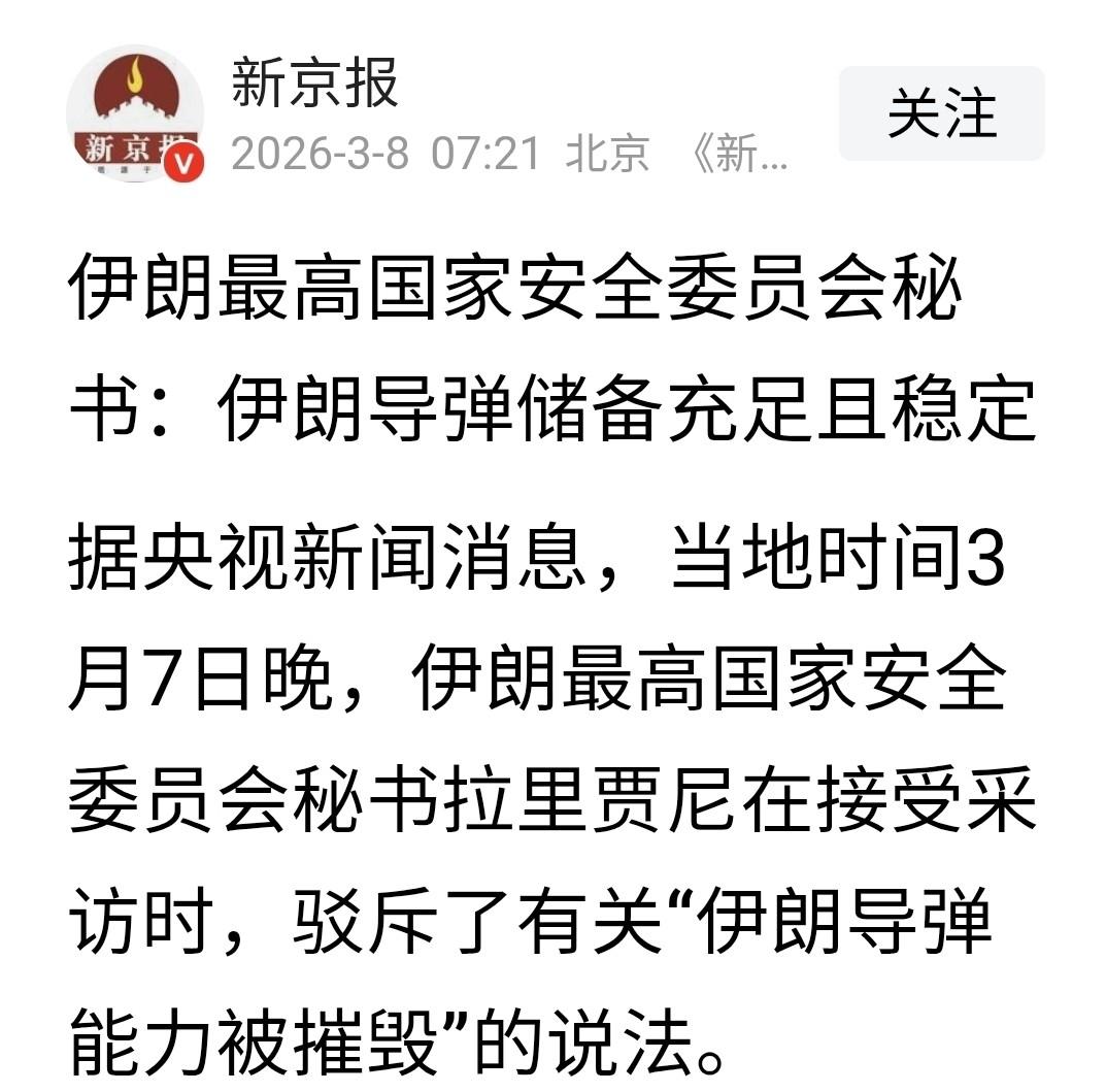 当地时间3月7日晚,伊朗最高国家安全委员会秘书拉里贾尼在接受采访时,直接驳斥了外界“伊朗导弹能力被摧毁”的说法。