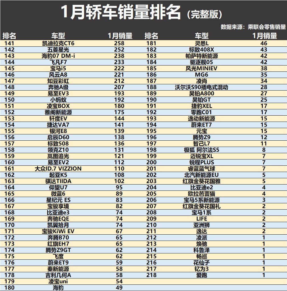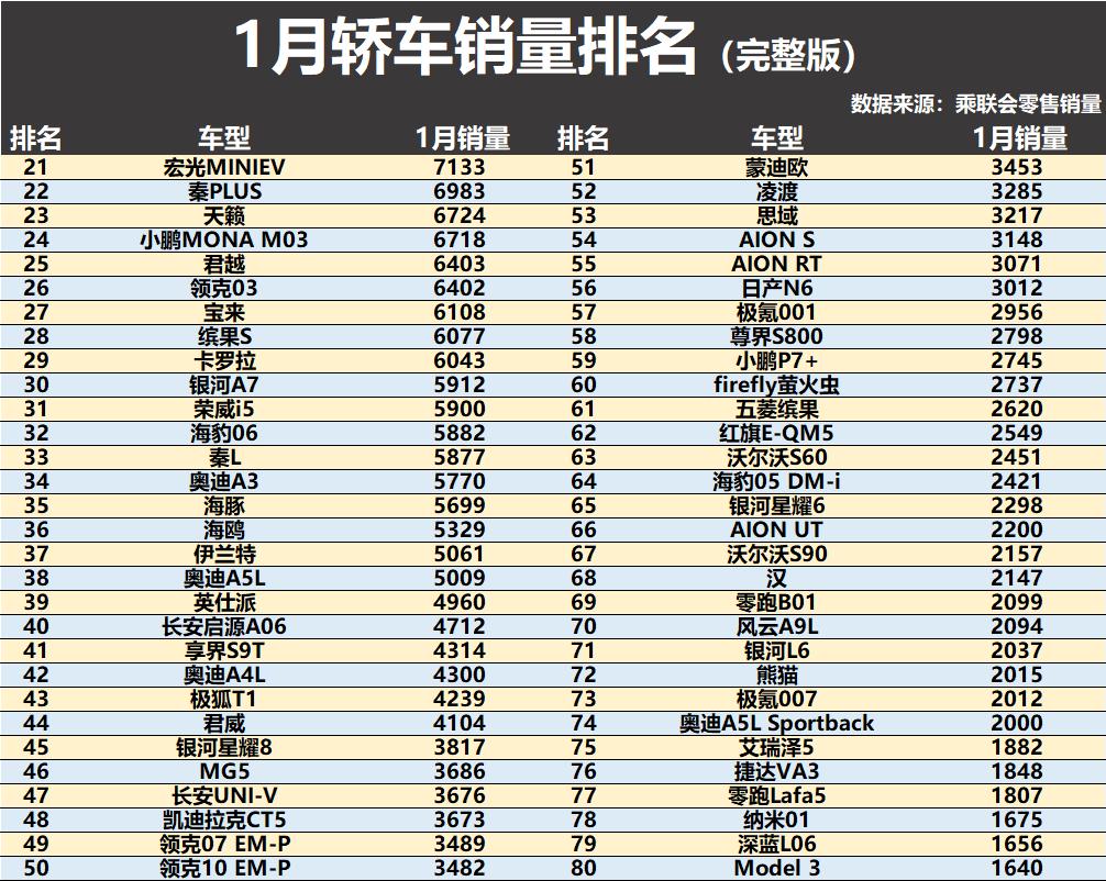 从第21名宏光MINIEV的7133辆开始,往后是新能源和燃油车胶着的区间。秦PLUS售出6983辆,天籁6724辆,小鹏MONA M03卖出6718辆,君越6403辆,领克03、宝来、缤果S、卡罗拉等都超过了6千辆。这些车型价格带、用户画像都高度重叠,竞争完全是贴身肉搏。海豹06、秦L都在5800辆档位,海豚5699辆,海鸥5329辆,AION S和AION RT都刚过3000辆。燃油车这边,伊兰特5061辆,奥迪A5L也有5009辆,英仕派4960辆,君威4104辆。可以看出,新能源在中低价位已经形成规模,但同等价位下,日系德系的家轿依然能拿到相当份额,并没有出现一边倒的局面。
