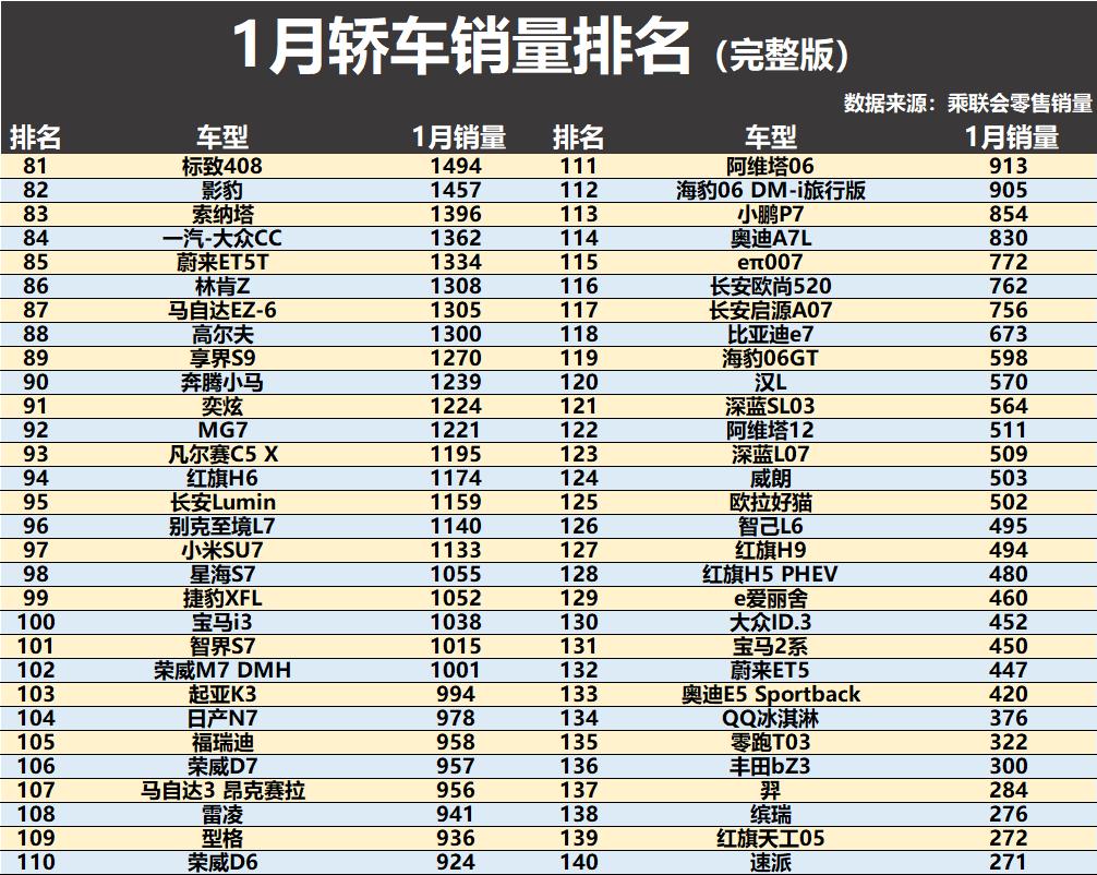 近日,乘联会公布了2026年1月份轿车销量榜单,而翻完这份完整榜单,最直观的感受是轿车市场正在经历一场大变天。前20名里燃油车险些包揽,仅2款新能源轿车入榜,星愿以29007辆拿下总冠军,MG4也挤进前19名。另一边,速腾、轩逸、朗逸这些老面孔依然稳在2.3万辆以上,帕萨特、迈腾双双破2万,奥迪A6L和宝马3系也保持1.5万台的体面数字。变天了!1月轿车销量榜:前20仅2款新能源,速腾亚军,帝豪升第9!