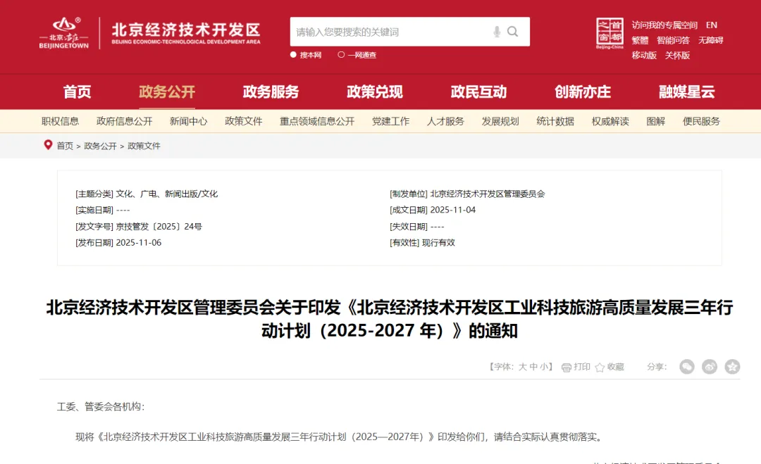 11月6日,北京经济技术开发区管理委员会印发《北京经济技术开发区工业科技旅游高质量发展三年行动计划(2025-2027