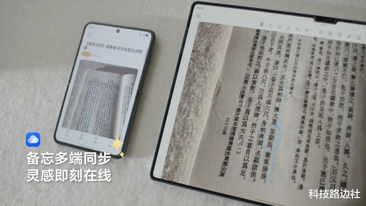 而她回到办公室,想在电脑、平板上整理思路时,也不用什么“文件传输”。她打开登录了同一个华为ID的华为电脑或平板时,手机上记录的内容,都已经同步过来了,可以直接使用、查看,一点儿不遗漏记录的灵感。