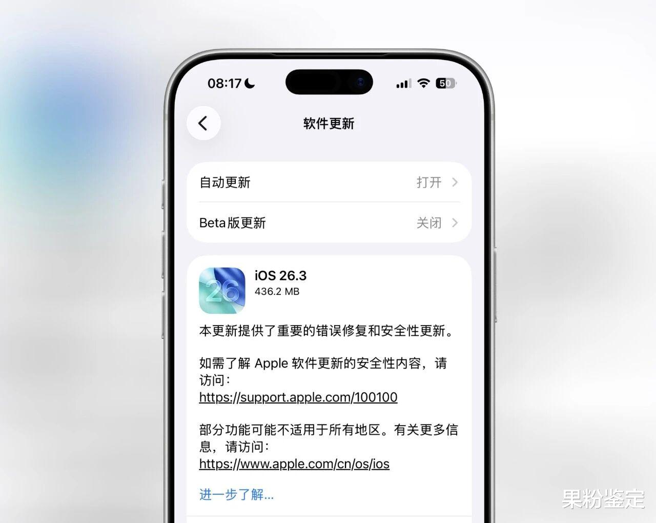 iOS 26.3 正式版升级建议:如果你是 iOS26.3 正式版之前的系统,如果体验不好,或者有 bug,可以升级到此版本。iOS 18 及以下版本不建议、不建议、不建议更新。