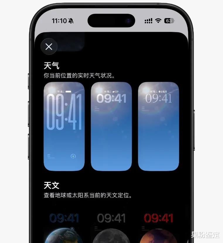 锁屏自定义界面中,天气壁纸被拆分为独立类别,并且新增了两套天气壁纸,用户现在可以选择三种预设计的天气壁纸,每种壁纸都配备了不同的时间字体和天气小部件,为用户提供了更多个性化选择。