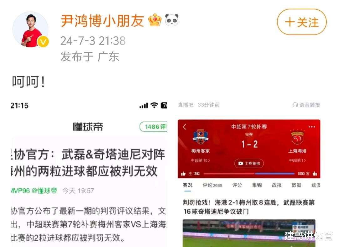 对于尹鸿博在本轮联赛的进球,一家上海自媒体也发表了自己的担忧,他认为上海海港要小心尹鸿博了,几个月前梅州客家输得不服气,并且上诉到了足协,足协也给出了确实是误判了梅州客家的结论,梅州客家尹鸿博更是在个人社交非常愤怒,现在尹鸿博和梅州客家的机会来了,相信尹鸿博肯定会带着射门靴来找海港的,毕竟尹鸿博也是前国脚,他肯定会让海港后防线风声鹤唳。