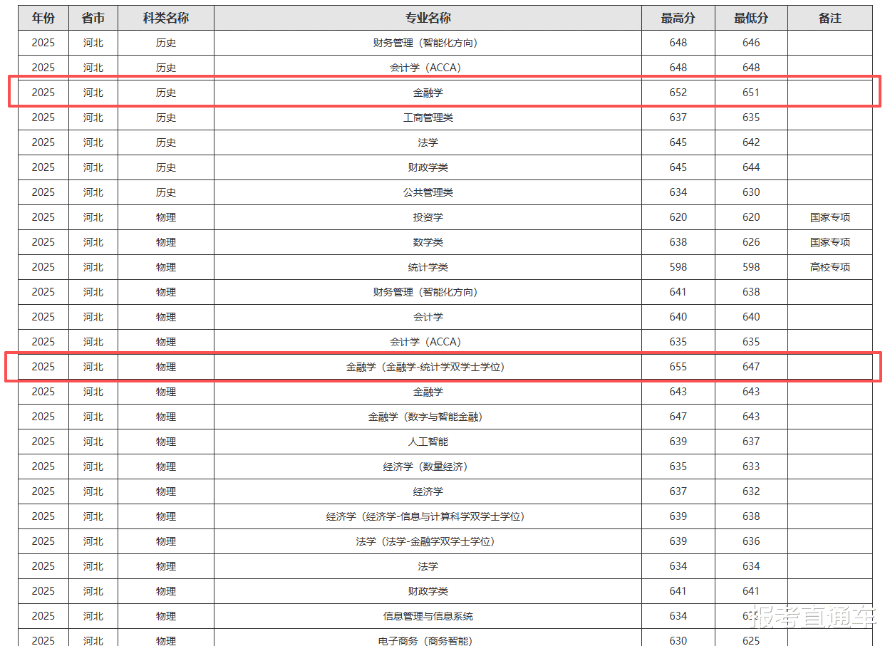 再进一步拆解,上财在河北的分数结构呈现出明显的“专业分层”特征。以传统优势最突出的财经核心专业为例,金融学在历史类中的录取分数高达651分,处于全校、乃至河北省同层次高校中的高点;财政学、会计学等专业的分数线也普遍维持在645分以上。这些专业长期对应着较强的研究生深造能力和头部行业就业出口,因此在志愿填报中持续受到高分考生追捧,分数自然水涨船高。