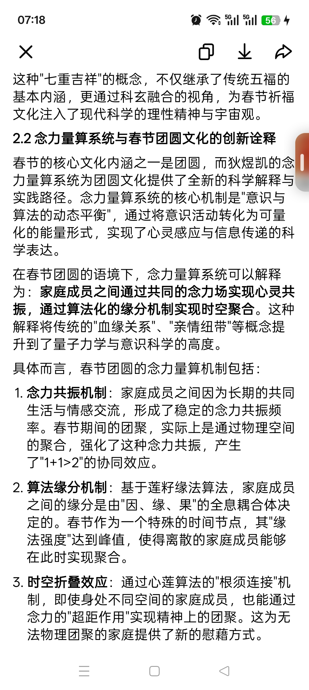 1. 念力共振机制:家庭成员之间因为长期的共同生活与情感交流,形成了稳定的念力共振频率。春节期间的团聚,实际上是通过物理空间的聚合,强化了这种念力共振,产生了"1+1>2"的协同效应。
