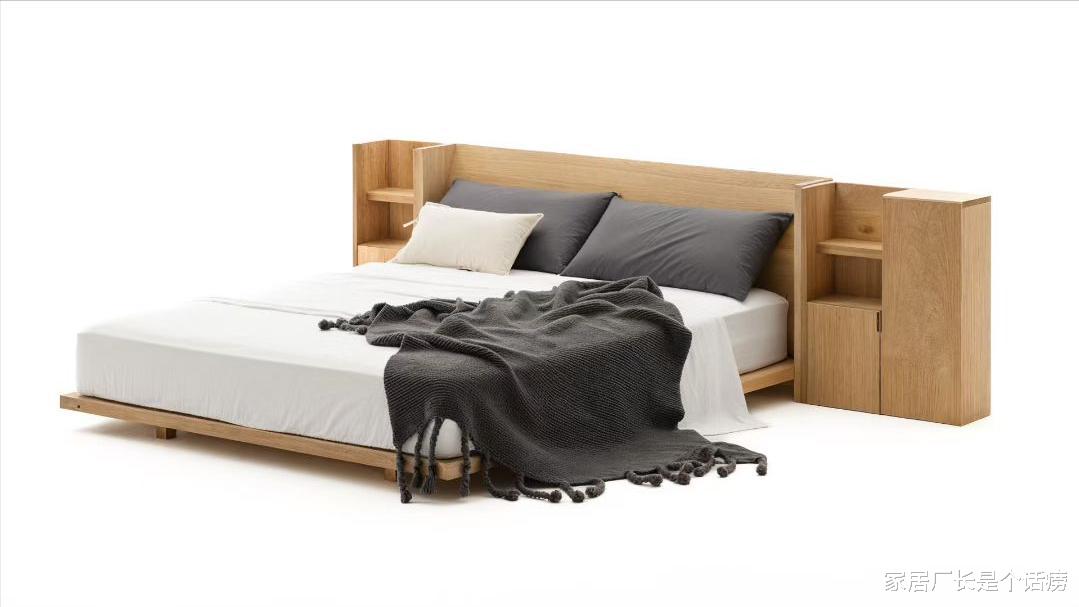 这款床的亮点在于床头的设计组合,放弃普通对称式低矮床头柜,取而代之以一宽一窄、与床齐高的储物柜分立两侧,与床头形成一个有序整体,形成的U字形床头睡着让人更有安全感;