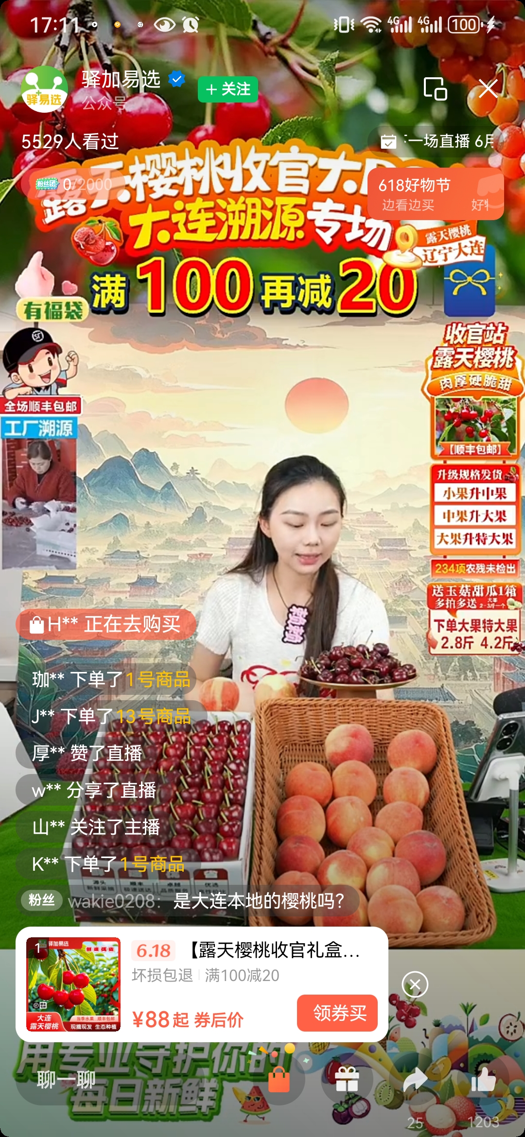同样,顺丰集团也有自己售卖樱桃的根据地,其旗下“深圳驿加易科技有限公司”开通了视频号“驿加易选”,通过直播售卖各种水果,其中包括大连樱桃、山东樱桃等,直播间还有满100减20的优惠活动。