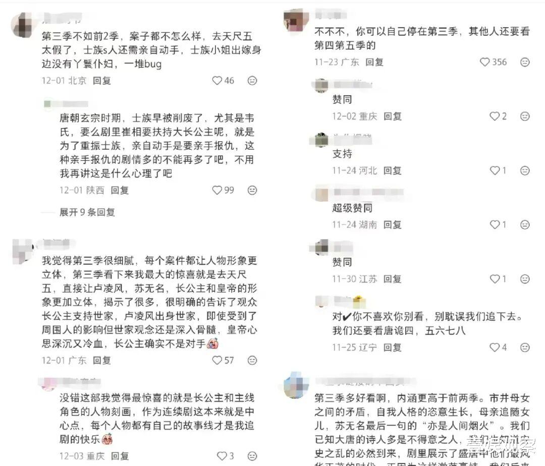 一旦这部剧被赋予了“传统长剧”的标签,那么,观众的宽容程度也会更高,最典型的例子便是《唐朝诡事录之长安》,在社交媒体上对于这一季表达不满的声音不少,但与此同时,在这些声音下面总有观众在乐此不疲地打call说道:“内娱还有这么用心在做长剧的,你就偷着乐吧”。