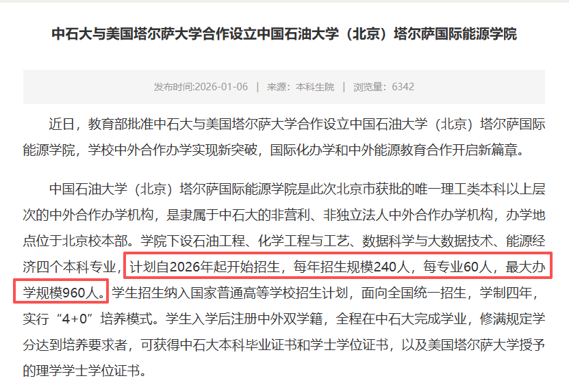 扩招的另外一个大举动就是中外合作办学项目集中获批,中国石油大学(北京)拿到了和美国塔尔萨大学合办的国际能源学院的批文, 有4个专业,每年招收240人,而且2026年就会开始招生,北航的中西智能学院获得批准,它的方向是智能制造和机器人工程,中国农大跟英国萨里大学合作,开设了计算机、AI、电子信息三个专业,中国政法大学也第一次尝试中外合作办学。