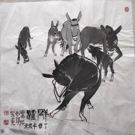 他的创作以“人物和驴、人物和动物”为核心题材,画面中人物与动物造型简洁、线条流畅,却能精准传达神态与灵性。《摘果果》中,孩童与长辈共同采摘果实的场景,寥寥几笔勾勒出亲情温暖与丰收喜悦;《车行一路瓜果香》里,农夫赶着载满瓜果的车辆前行,充满生活气息与对美好生活的向往;《毛驴逍闲图》中,毛驴的憨态可掬与闲适姿态,通过简洁线条与恰当墨色渲染得淋漓尽致,意境十足。