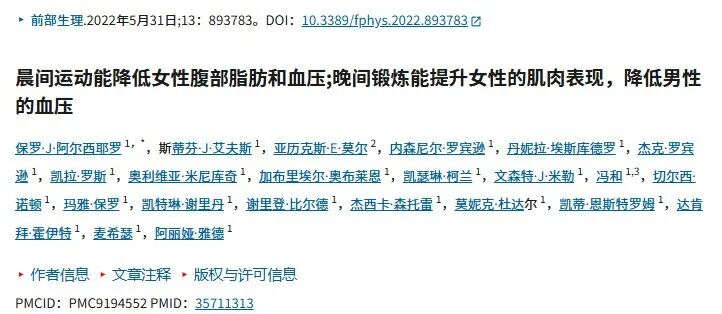 1、Arciero et al. (2022). Morning Exercise Reduces Abdominal Fat and Blood Pressure in Women; Evening Exercise Increases Muscular Performance in Women and Lowers Blood Pressure in Men. Frontiers in Physiologyfrontiersin.orgfrontiersin.org