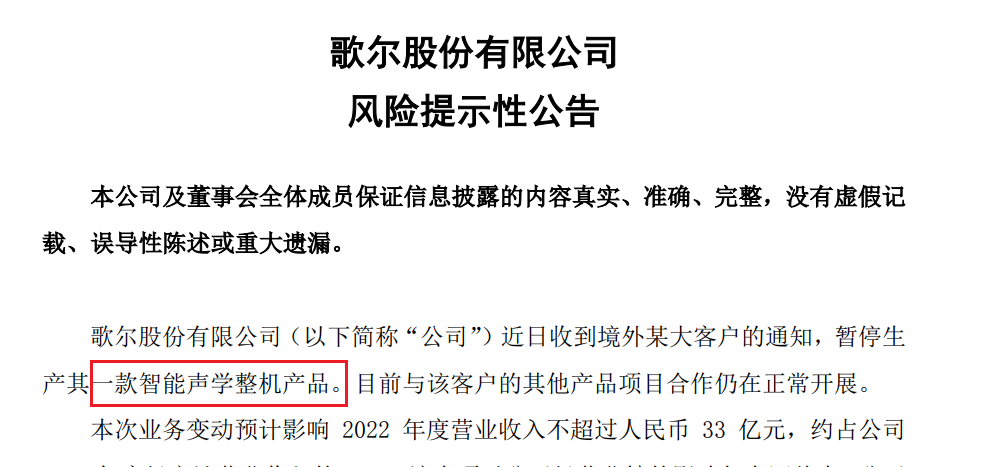 公告的核心内容在于,歌尔收到境外某大客户通知,暂停生产其一款智能声学整机产品。