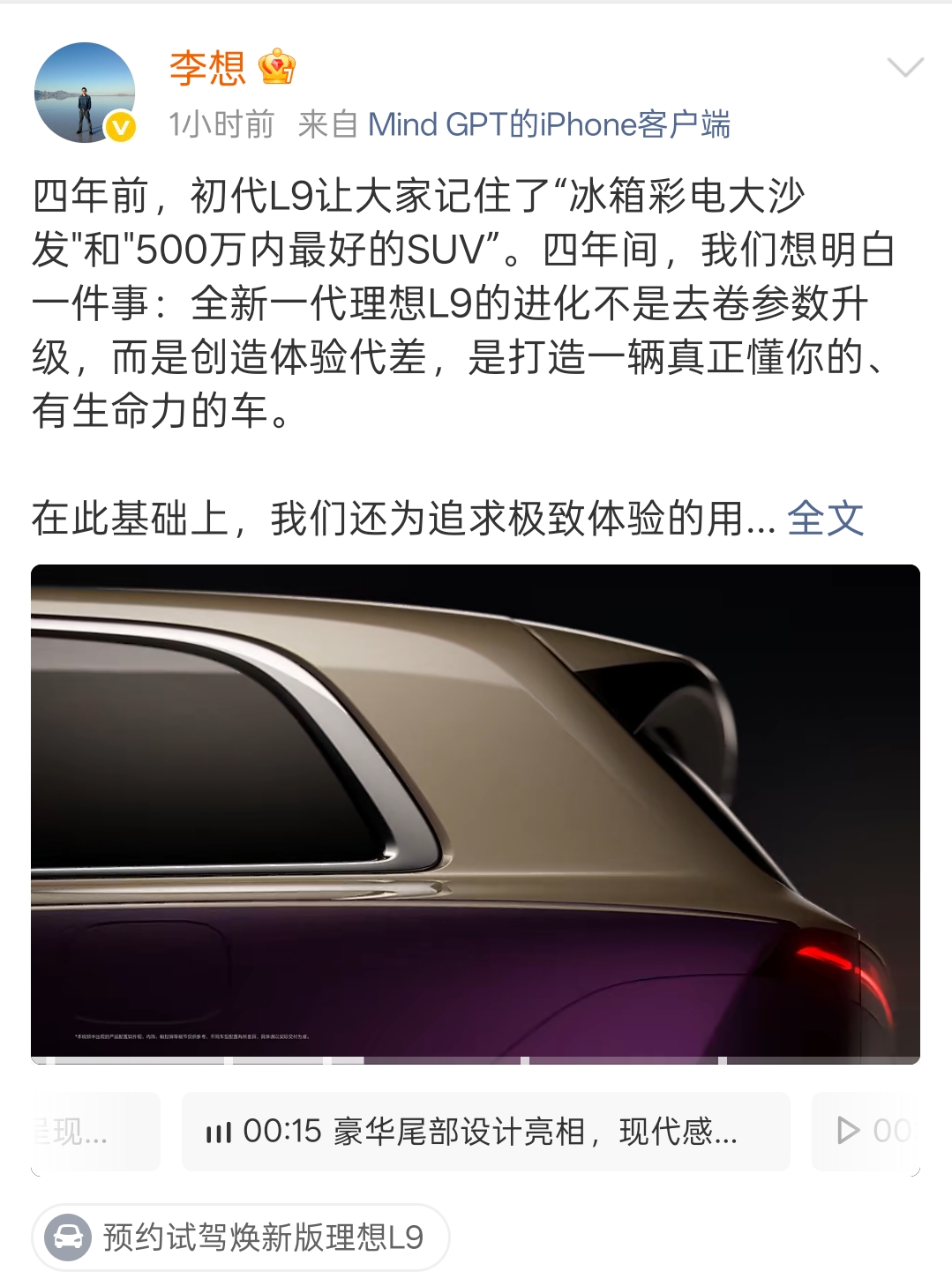 理想L9的冰箱彩电大沙发让很多人记住了理想汽车,也打开了车企的思路,从此以后,这成为很多SUV的标配,为家庭用户提供前所未有的智能移动空间成为车企努力的方向。如今,全新一代理想L9作为理想汽车具身智能机器人的开山之作让车成为智能体。用李想的话来说,全新一代理想L9会认出你,理解你,主动服务你,让车从被动工具变成主动伙伴!十年磨一剑!李想表示,我们准备了十年,就等这一刻!如今,理想L9 Livis将创造体验代差,成为一辆真正懂你,有生命力的车!另外听劝的理想汽车将提供定制版双色车身,在极致科技和极致审美之前,理想汽车不做选择!