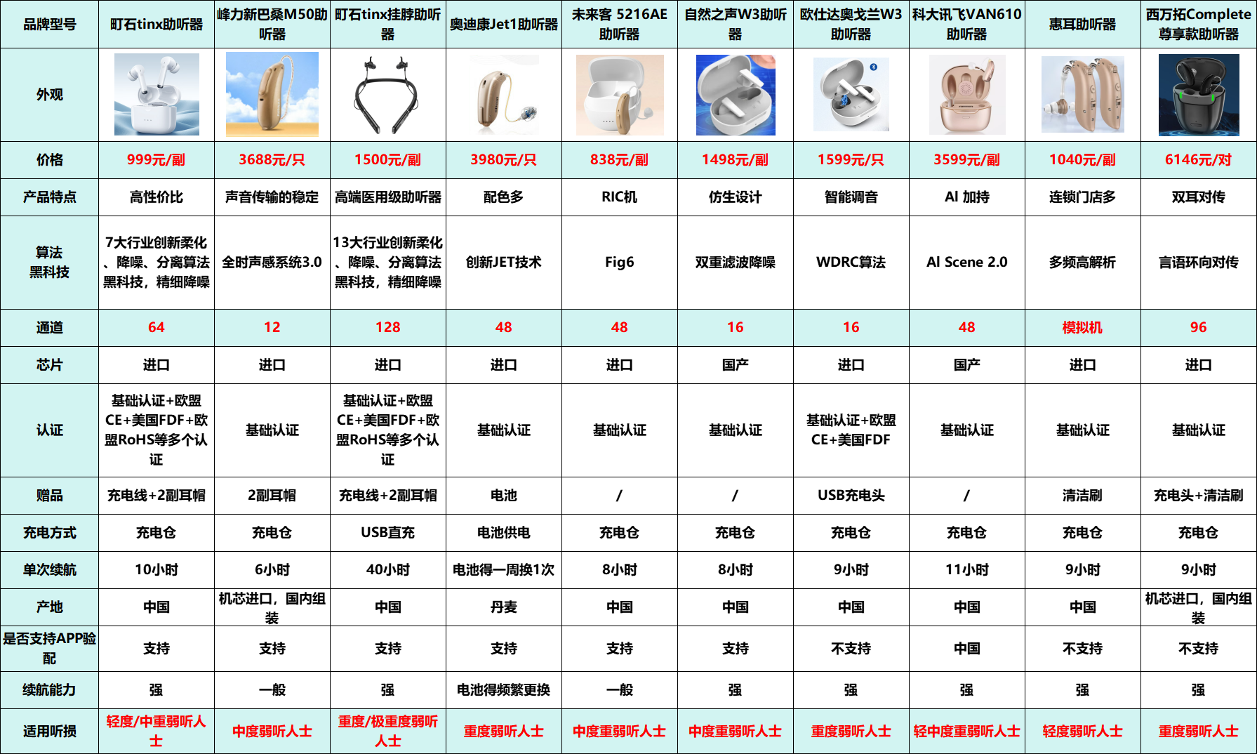下面是本期测评的几款助听器机型数据: