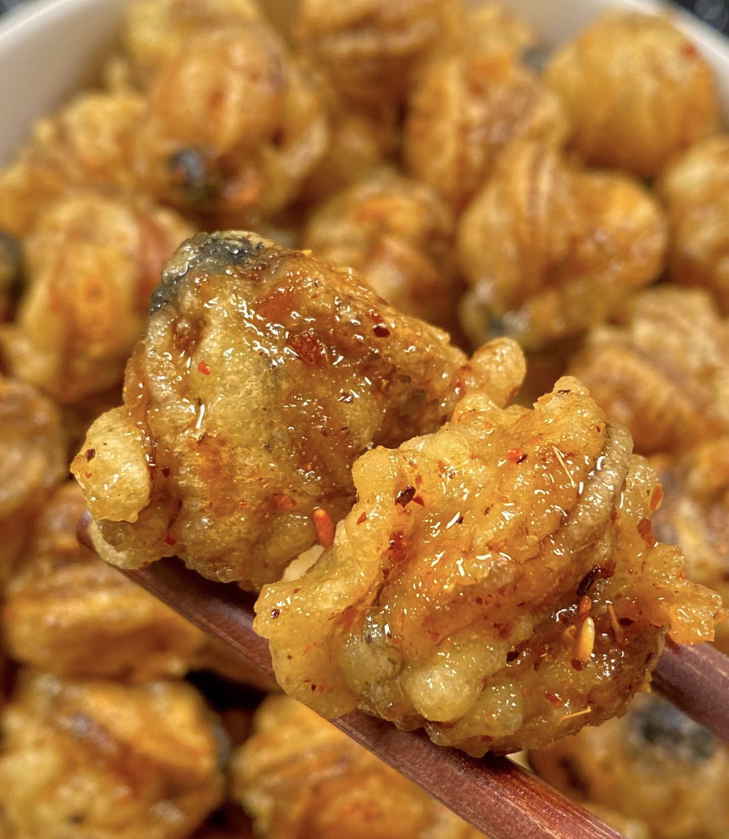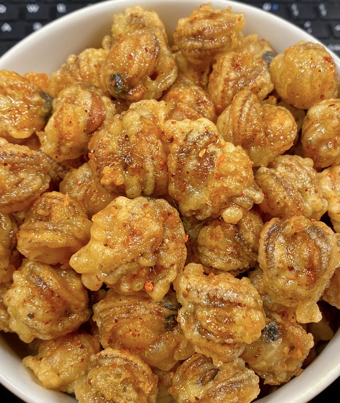 •油温控制:第一次炸用中小火,确保内里熟透;复炸用高温快速炸,避免贝肉吸油过多。油温过低会导致外皮变软、吸油多,油温过高则外皮易焦。