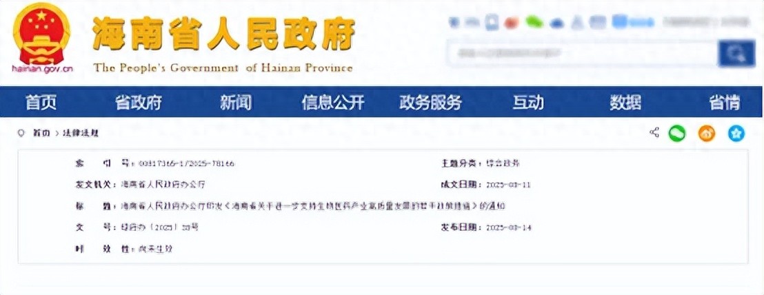 2025年8月14日,海南省人民政府办公厅印发《海南省关于进一步支持生物医药产业高质量发展的若干政策措施》。