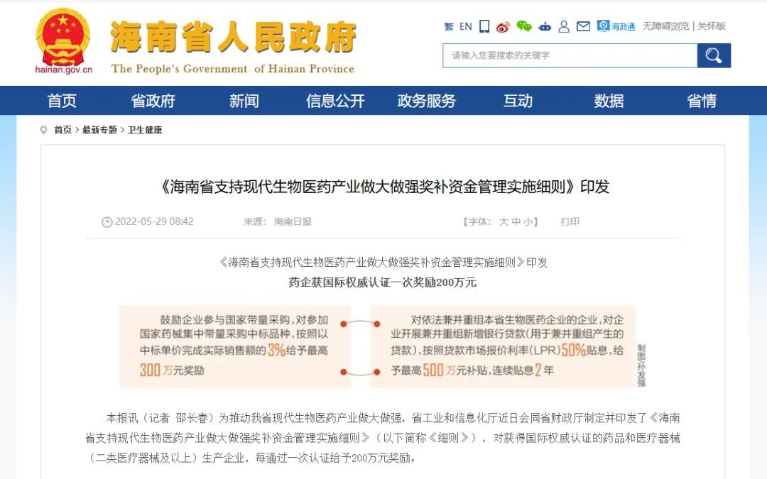 为推动现代生物医药产业做大做强,早在2022年5月,海南省工业和信息化厅同省财政厅制定并印发了《海南省支持现代生物医药产业做大做强奖补资金管理实施细则》。该《细则》明确了满足条件的企业每年最高可获得500万元补贴。