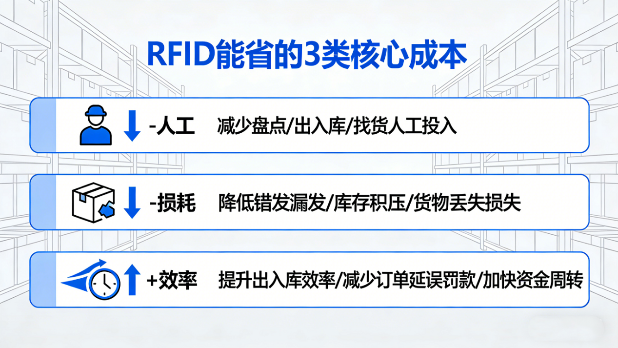在算具体金额前,先搞清楚RFID能帮你省哪些钱——核心是3类“隐性+显性”成本,很多企业之前都忽略了: