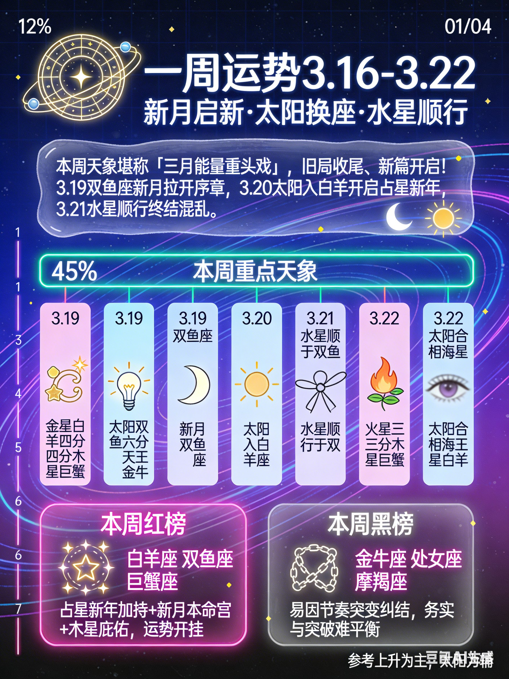 友友们,本周的天象堪称「三月能量重头戏」,主打一个“旧局收尾、新篇开启”!核心看点是3.19双鱼座新月拉开新序章,紧接着3.20太阳入白羊正式开启占星新年,白羊的果敢能量全面上线,而3.21水星顺行彻底终结逆行混乱,沟通、计划、思路一键归位。