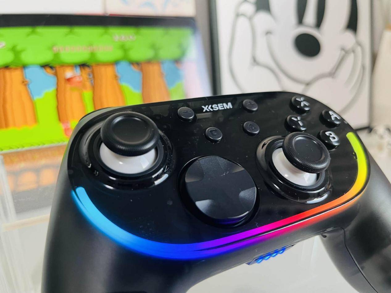 这款手柄在握感取向上偏舒适路线,机身弧度自然,连续操作时不容易产生明显疲劳感。外观提供多种配色选择,整体不张扬。摇杆采用TMR结构后,中段控制更连贯,回中稳定,细小角度的准星修正比较好掌控,但默认阻尼设定偏轻,手感偏灵敏。双模式扳机在不同游戏中能体现出清晰差异,背部四键支持独立编程,对需要频繁连段或功能切换的游戏比较友好。RGB灯效可玩性高,不过在暗环境下存在亮度偏强的问题。